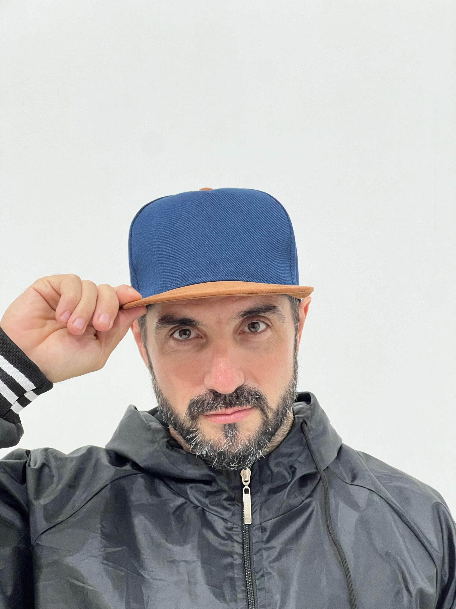 GORRA GAMUZDA COMBINADA CON VISERA PLANA. AZULMARINO/GAMUZADO