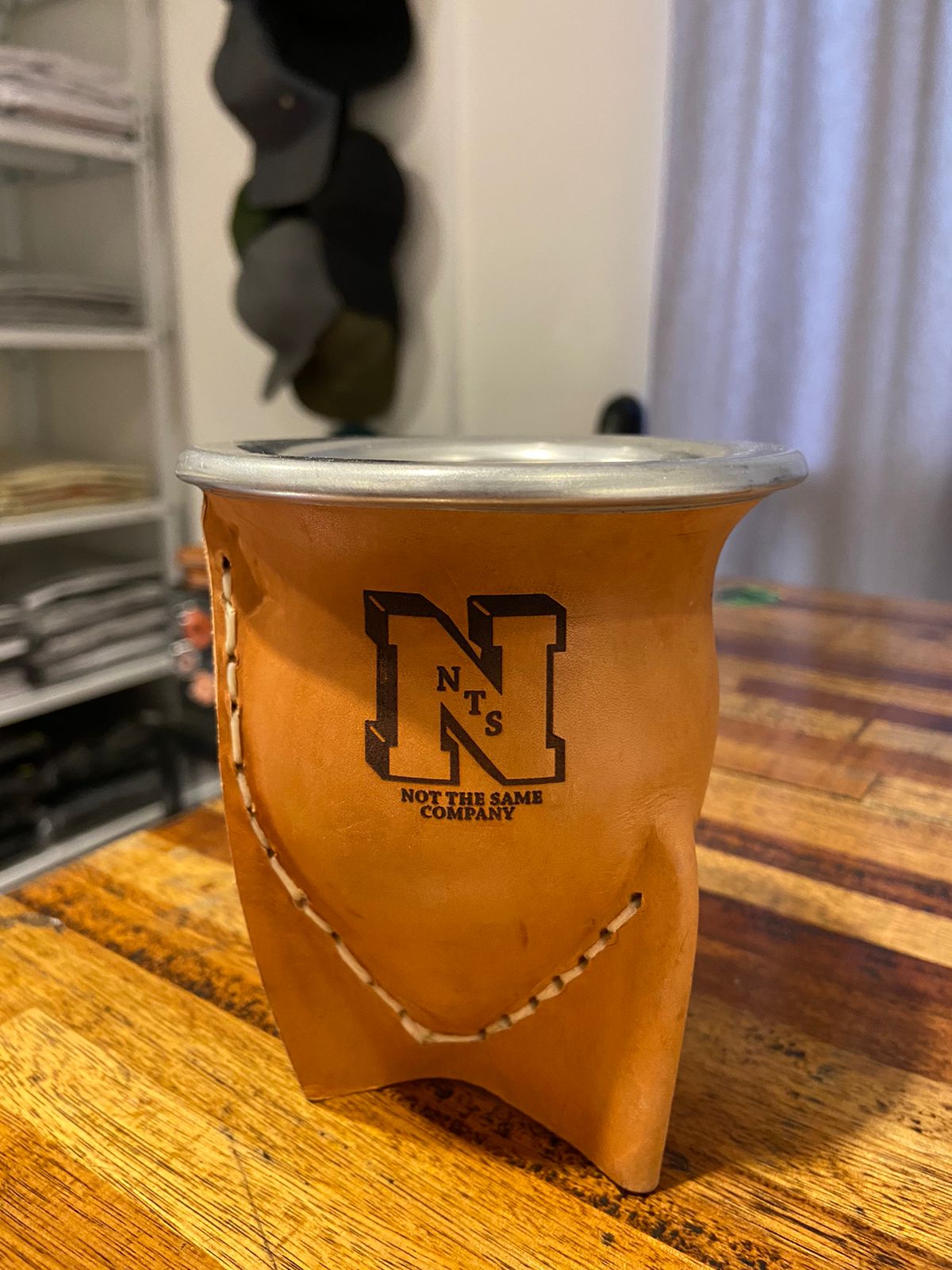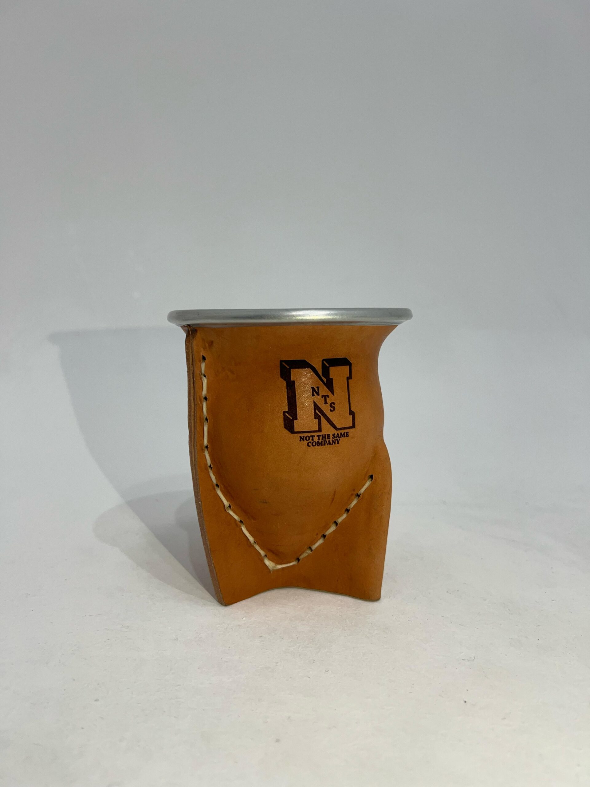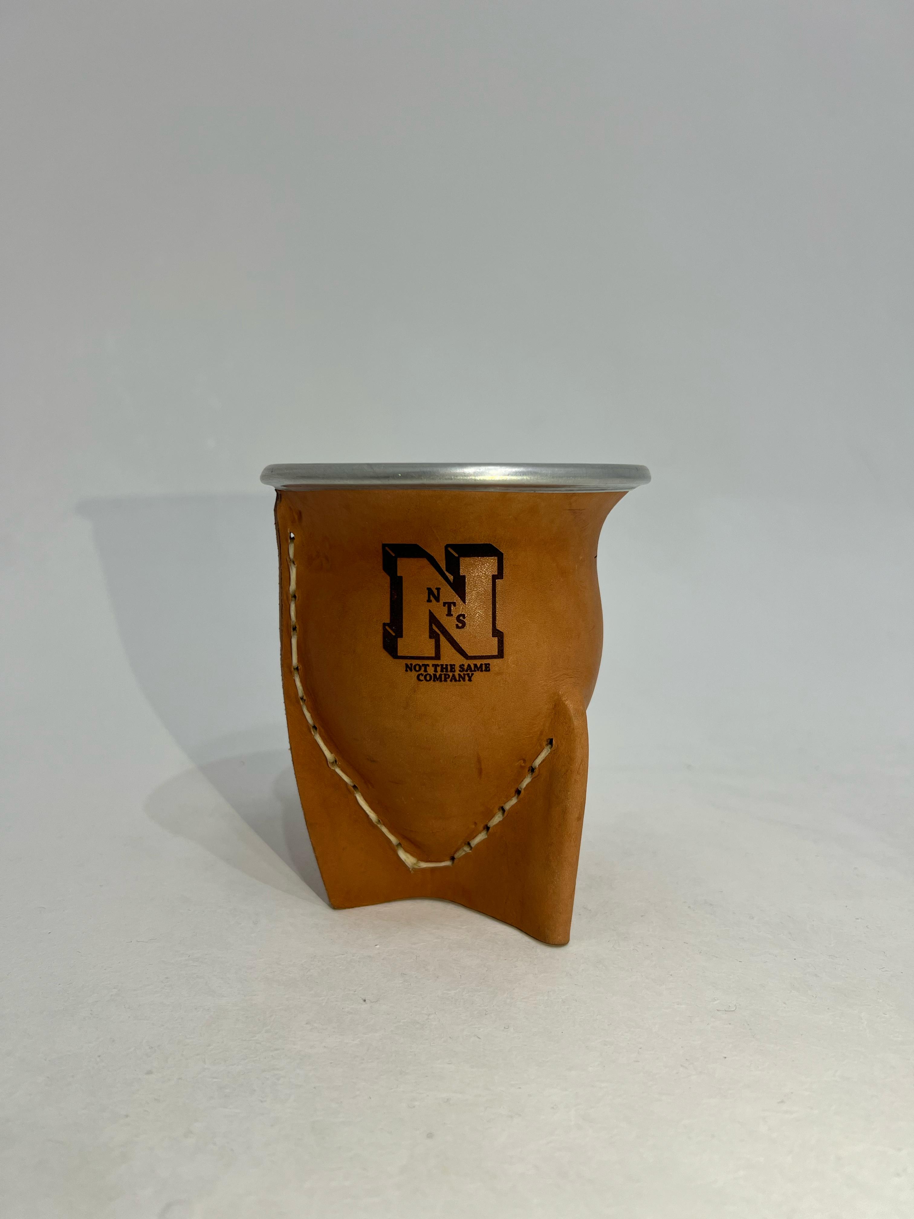 MATE DE LA CALABAZA FORRADO EN VAQUETA, TIENE TRES PATAS Y BOCA ANCHA, EL MISMO POSEE UNA VIROLA DE ACERO EN SU PARTE SUPERIOR.